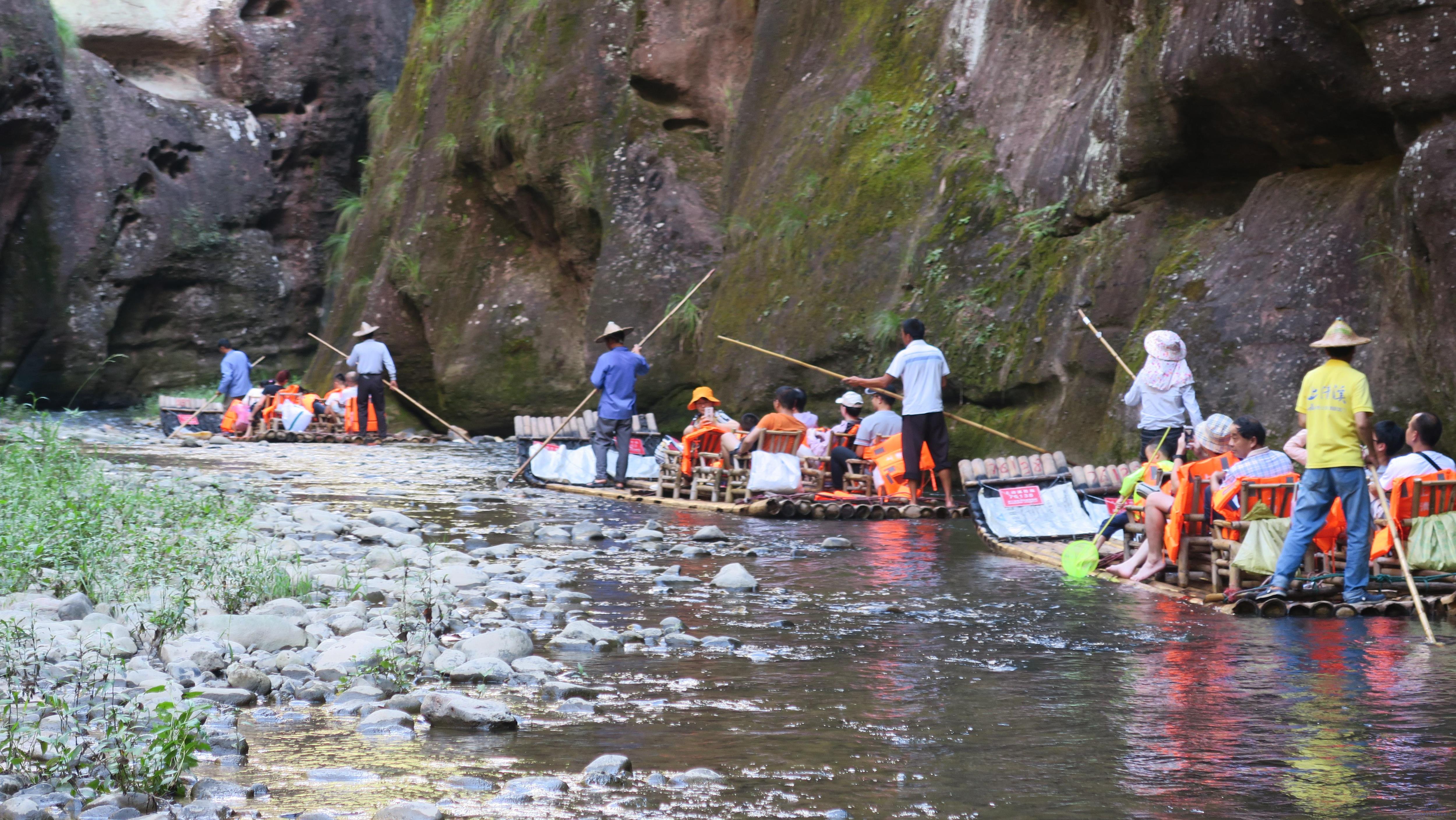 乘著“華東第一漂”的上清溪竹排漂流而下,一路水聲盈耳。滿溪美景在望,在千回百轉(zhuǎn)間,暢快體驗(yàn)野、幽、奇、趣的原生態(tài)區(qū)漂流樂趣。