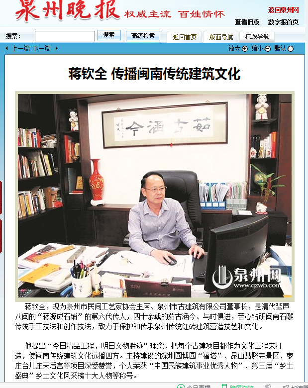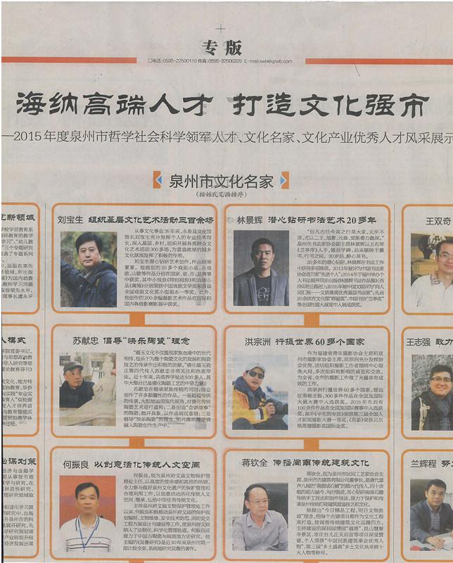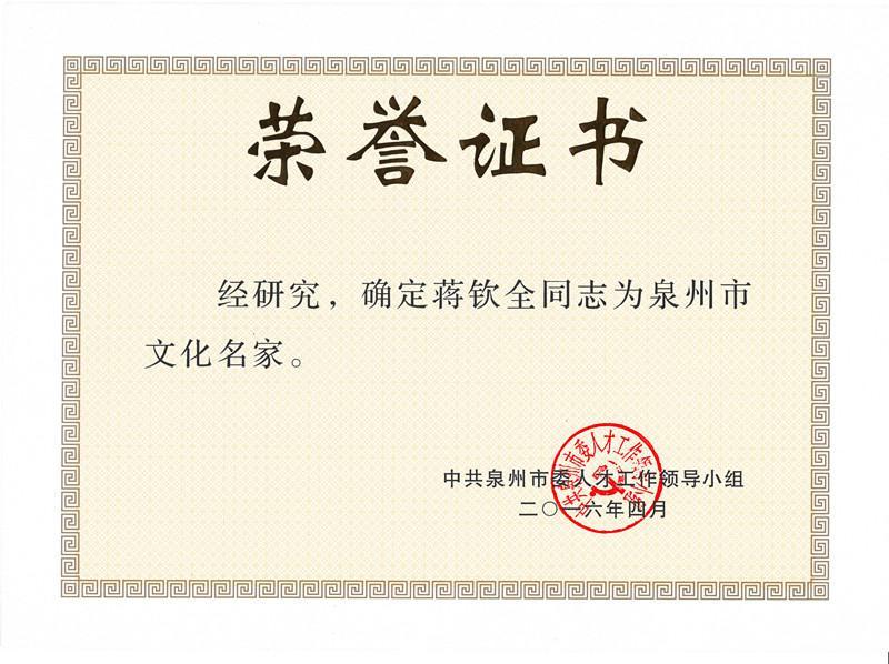 蔣欽全董事長榮獲“2015年度泉州市十大文化名家”稱號