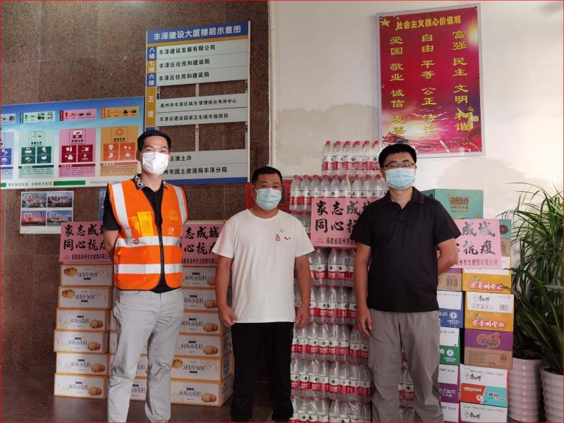 當?shù)弥S澤區(qū)需要支援抗疫物資的消息,公司董事長、總經(jīng)理立刻通知辦公室積極配合準備。9月22日一早,公司常務副總李澤平帶領工作人員,將礦泉水、蛋糕、泡面等抗疫物資送到豐澤區(qū)住建局,以便調(diào)配到有需要的抗疫工作處。
