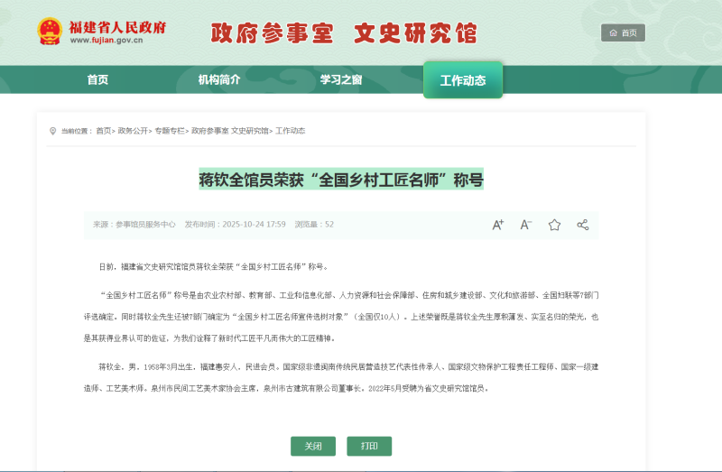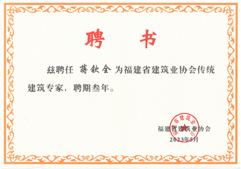 董事長蔣欽全受聘為福建省建筑業協會傳統建筑專家