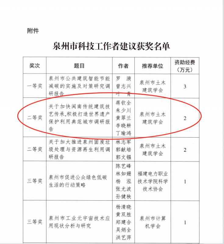 泉州市科學技術協會《學會》雜志社關于公布2023年度泉州市科技工作者建議獲獎名單的通知