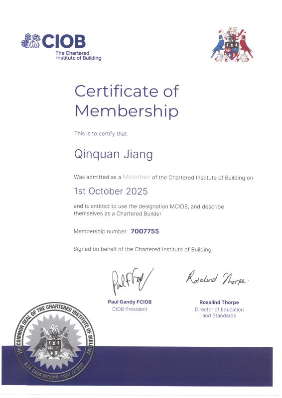 蔣欽全獲得CIOB英國皇家特許建造師