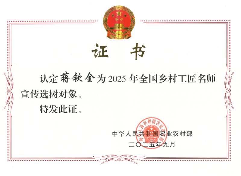 蔣欽全獲得2025年全國鄉村工匠名師宣傳選樹對象