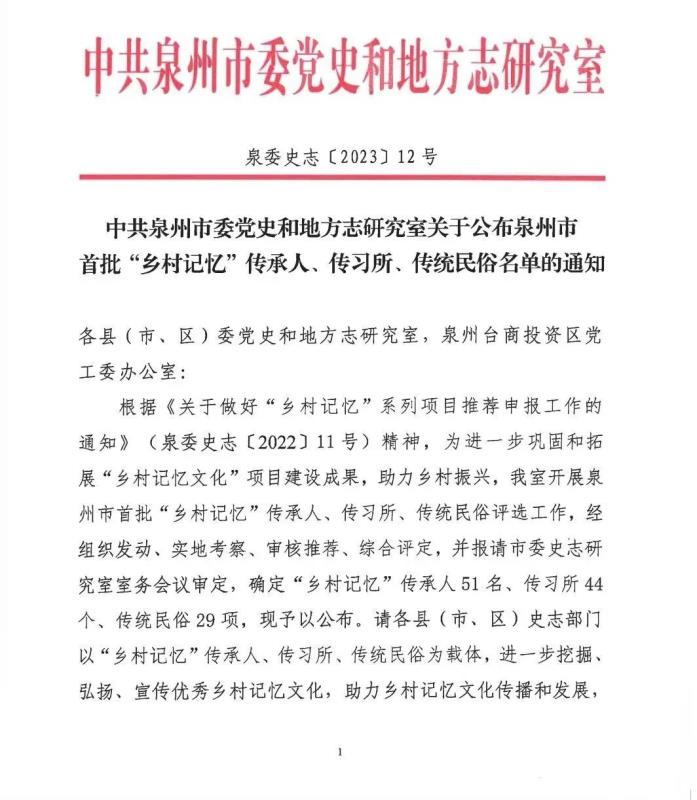 公布泉州市首批“鄉村記憶” 傳承人、傳習所、傳統民俗名單