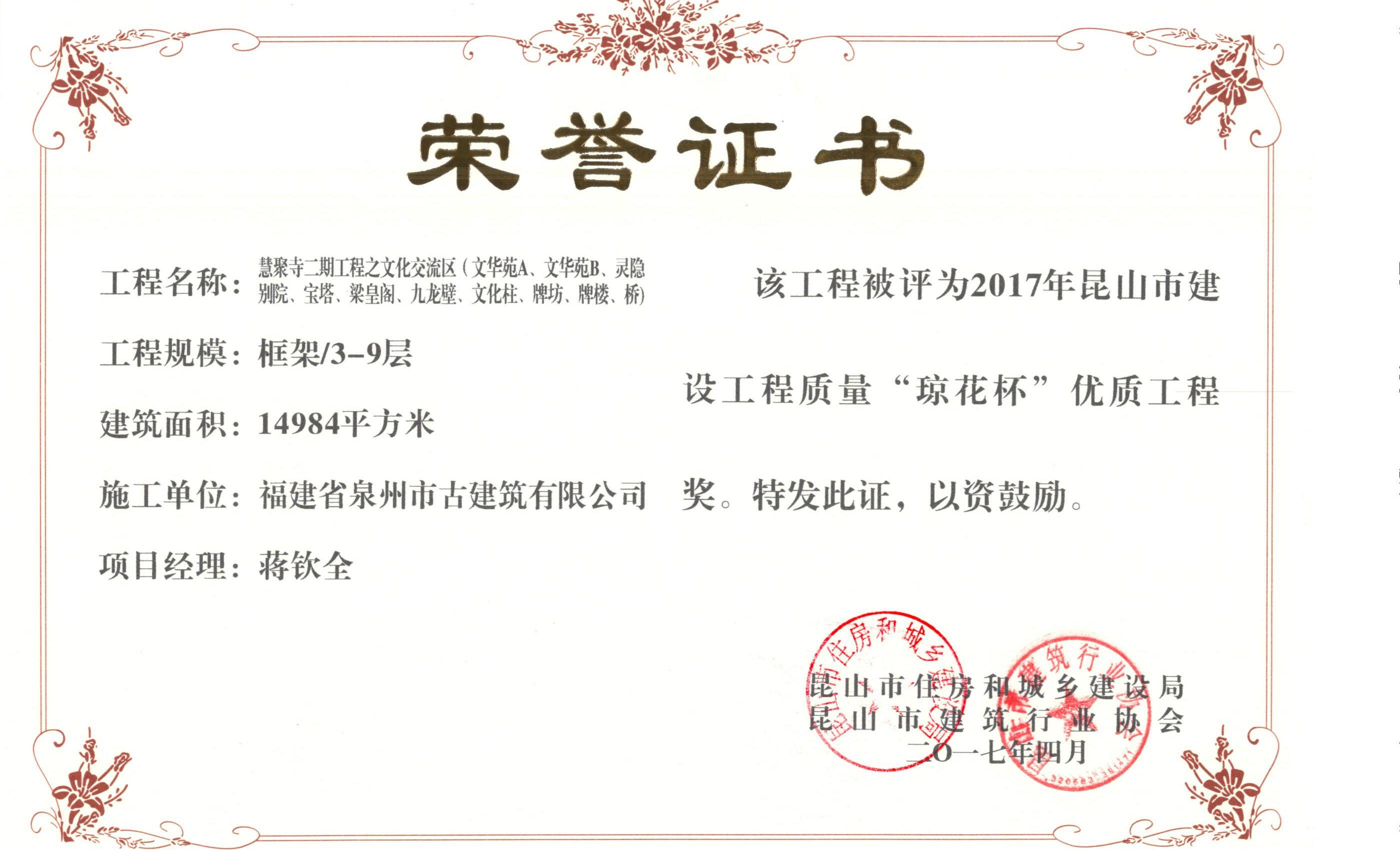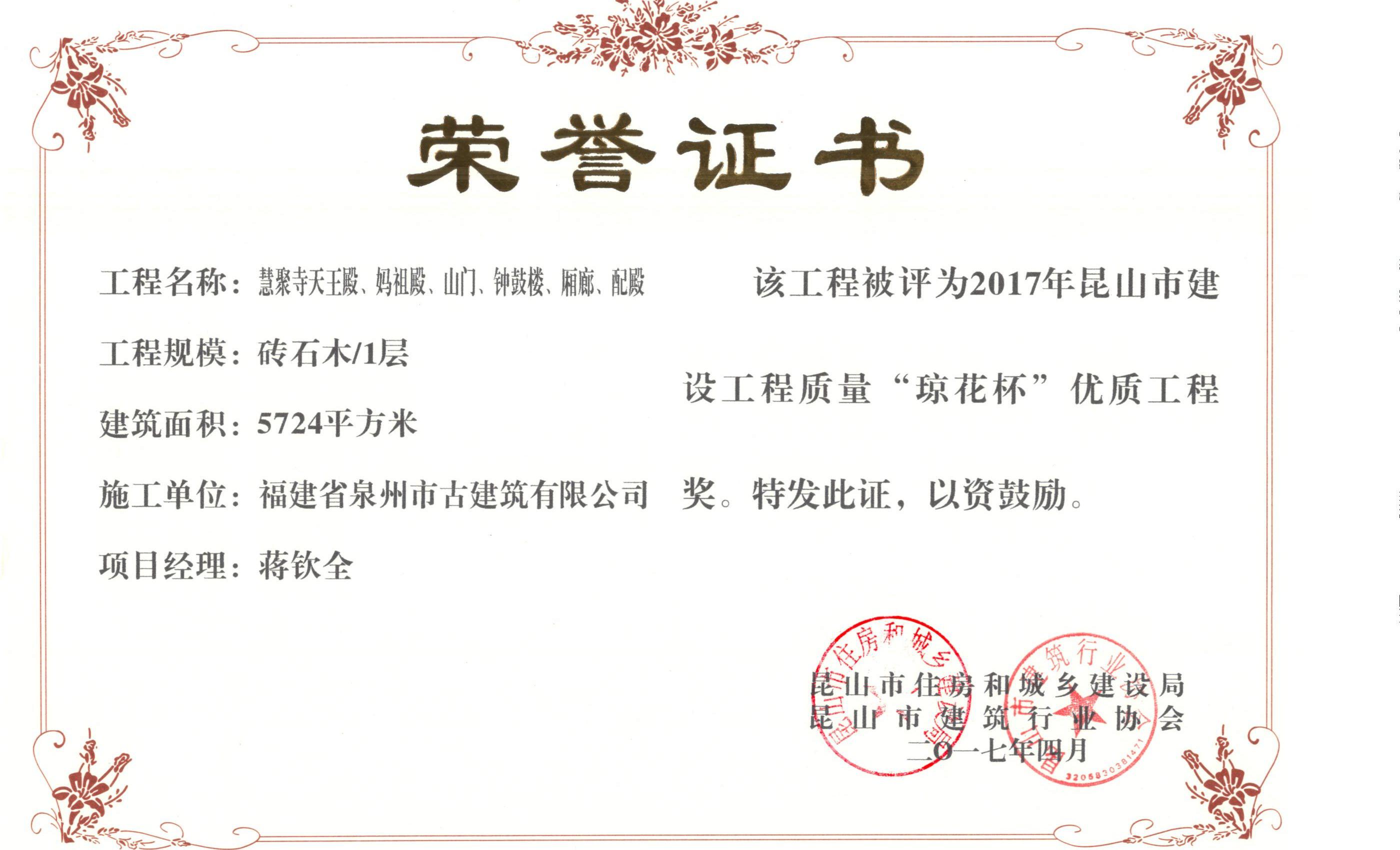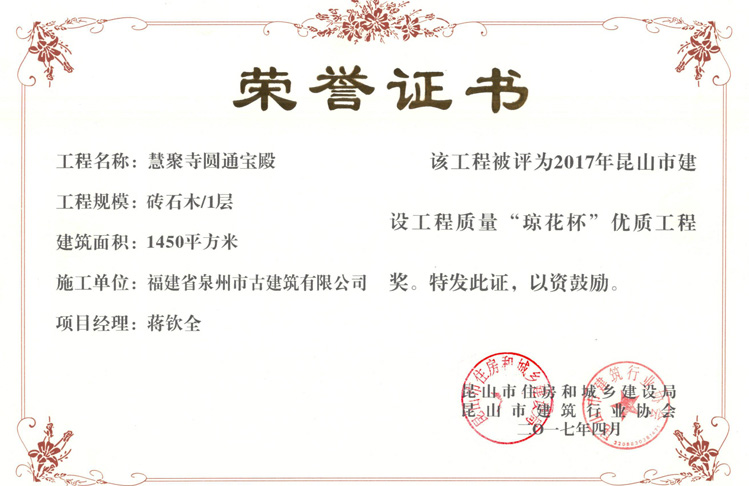 江蘇昆山慧聚寺工程(二期)榮獲昆山市建設(shè)工程質(zhì)量“瓊花杯”優(yōu)質(zhì)工程獎