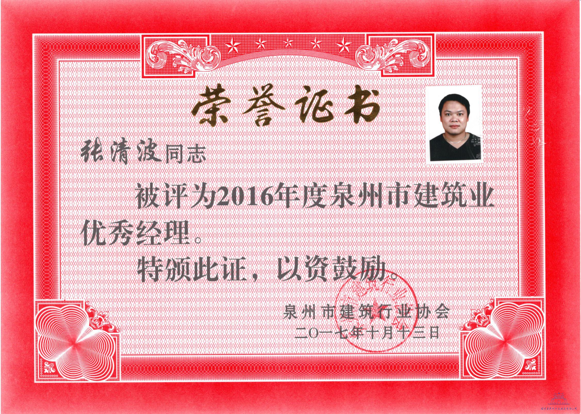我司張清波榮獲2016年度泉州市建筑業(yè)優(yōu)秀經(jīng)理