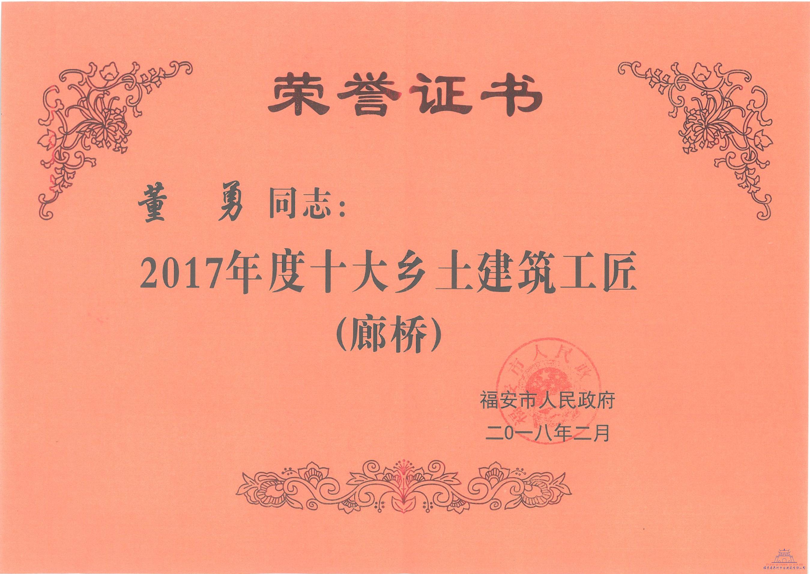 項目經(jīng)理董勇榮獲“福安市2017年度十大鄉(xiāng)土建筑工匠”