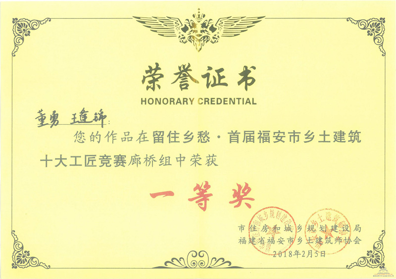 項目經(jīng)理董勇榮獲“福安市首屆鄉(xiāng)土建筑十大工匠競賽”廊橋組中榮獲一等獎