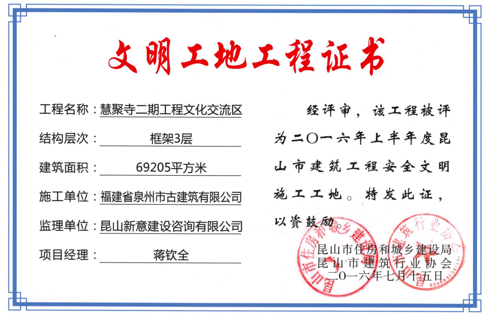 江蘇省昆山慧聚寺工程(二期)榮獲昆山市建筑工程安全文明施工工地獎