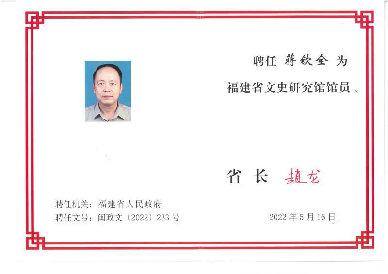 董事長蔣欽全受聘為福建省文史研究館館員